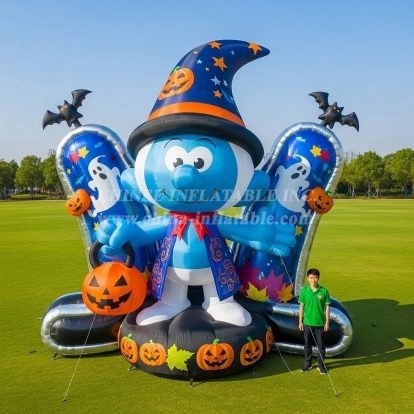 Bring playful spooky vibes to your venue with the Cartoon3-419 The Smurfs Halloween Inflatable Cartoons from Chinee Inflatables. This eye‑catching display features a cheerful blue character styled as a friendly wizard, complete with a starry hat, pumpkins, and festive bats and ghosts—perfect for family‑friendly Halloween scenes. Designed as a decorative showpiece, it is not a bouncer or slide, making it ideal for entrances, photo spots, and themed staging.