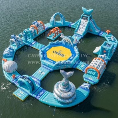 Make waves with the S287 Ocean Theme Water Park by Chinee Inflatables Inc., a spectacular floating adventure course designed for lakes, bays, and calm seaside venues. This modular park blends a vibrant under‑the‑sea aesthetic with thrilling activities: a central jump zone, splash-friendly slide modules, dolphin archways, climb-and-crawl obstacles, balance beams, and a dramatic mermaid-tail centerpiece that draws crowds from the shoreline. The connected layout supports continuous play flow and easy supervision, while generous walkways and hand-assist features help participants traverse safely between elements.