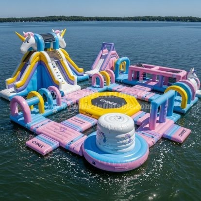Create a show‑stopping waterfront attraction with the S337 Unicorn Theme Water Park from Chinee Inflatables Inc. This pastel, fantasy‑styled floating course blends slides, balance tracks, climbers, hurdles, and a central jump area into one cohesive layout, crowned by twin unicorn slide towers and rainbow‑arch passages. Designed for lakes, bays, and calm seaside venues, it delivers continuous flow, high throughput, and Instagram‑worthy visuals that draw crowds of families and teens alike.