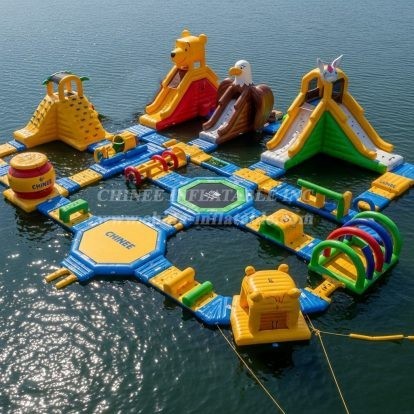 Chinee utilise un matériau personnalisé anti-UV et résistant à la chaleur, ce qui prolonge la durée de vie du parc aquatique flottant de 30% à 50% par rapport au matériau normal que la plupart des fournisseurs ont utilisé, notamment dans les zones à forte exposition aux rayons UV et aux températures élevées.