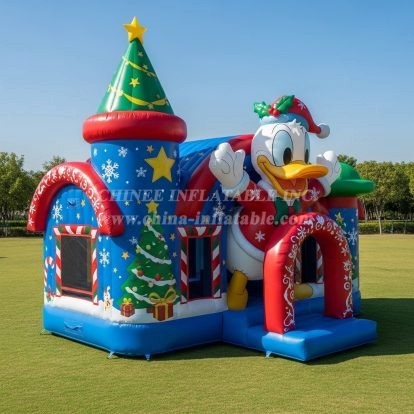 Bring festive magic to your next event with the T2-8586 Donald Duck Christmas Inflatable Bouncer. Designed as a cheerful holiday cottage adorned with snowflakes, stars, and a Christmas tree, this eye‑catching bounce house features a large Donald Duck figure welcoming kids at the entrance. The bright red-and-blue color palette and candy-cane trim create an instant winter wonderland that draws families from across the venue.