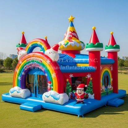 Bring holiday magic to your events with the T2-8599 Christmas Theme Inflatable Bouncer from Chinee Inflatables Inc. This cheerful bounce house features a colorful rainbow archway, festive towers topped with stars and Santa hats, and bright seasonal graphics that delight kids at first glance. The spacious bouncing area, safety step at the entrance, and mesh viewing windows make it ideal for community fairs, school festivals, shopping mall activations, and rental fleets during the winter season.