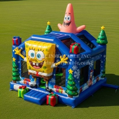Bring holiday cheer to your next event with the T2-8641 SpongeBob Christmas Theme Inflatable Bouncer from Chinee Inflatables. This vibrant bounce house features a joyful SpongeBob entrance, festive trees, wrapped gifts, and snowflake graphics that instantly set a winter celebration vibe. The roomy jumping area keeps kids active and entertained, while mesh windows on all sides provide excellent airflow and clear visibility for easy supervision. A wide safety step at the front helps little ones enter and exit confidently.