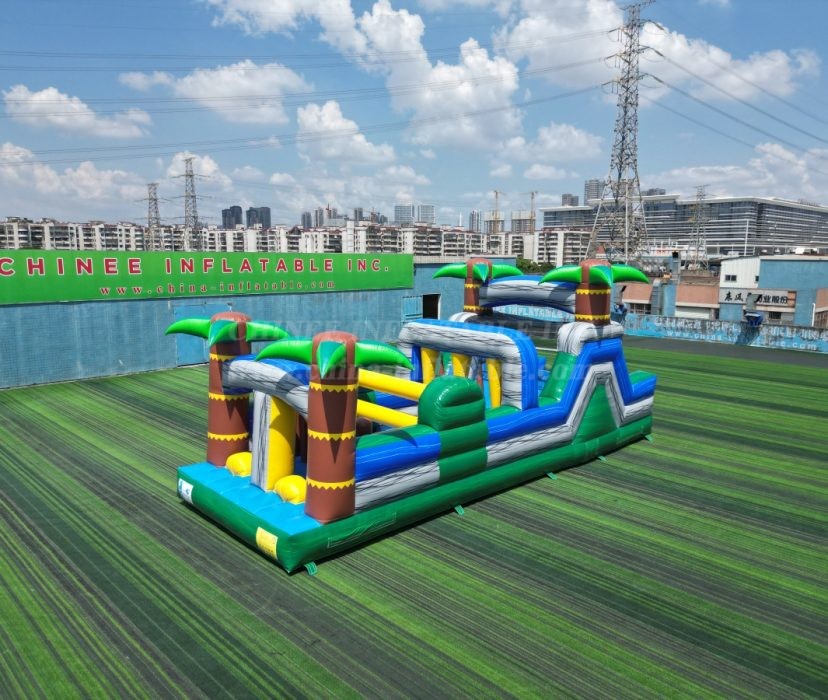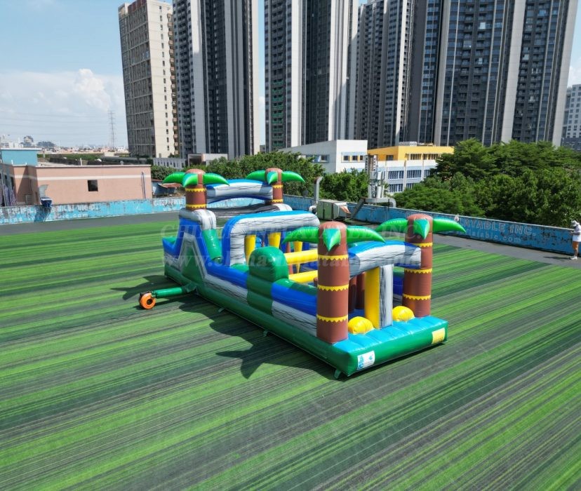 Participants will start their jungle expedition by diving through tunnels, pushing past vertical pop-ups, navigating horizontal hurdles, and scrambling up the final challenge to see who finishes first. The vibrant green, blue, and grey design, topped with towering inflatable palm trees, creates a visually stunning centerpiece for any party or event.