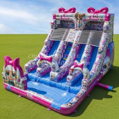 Make every celebration sparkle with the T8-8755 L.O.L. Surprise Inflatable Water Slide from Chinee Inflatables. This vibrant dual‑lane water slide is drenched in colorful L.O.L. artwork, bows, and starry accents that instantly catch the eye. Kids race up the central climbing lane, zoom down two extra‑wide slides, and splash into the generous landing pool for non‑stop summer fun.