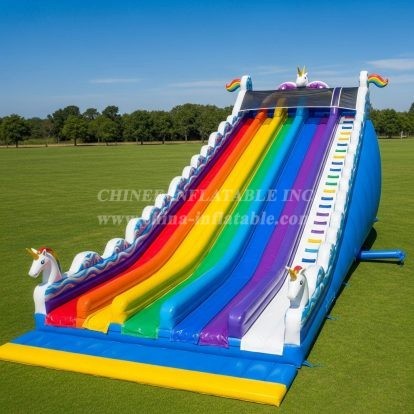 Bring vibrant fun to any event with the T8-8824 Rainbow Inflatable Slide! Featuring dazzling rainbow-colored lanes and charming unicorn accents, this giant slide delivers an unforgettable experience for kids and adults alike. Its eye-catching design and high-quality construction ensure safety, durability, and endless excitement. Perfect for festivals, parties, and outdoor gatherings, this inflatable slide is sure to be the star attraction wherever it goes.