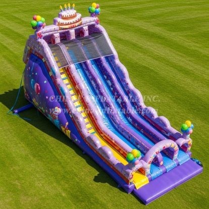 This vibrant inflatable slide features colorful birthday decorations including a large birthday cake with candles and festive balloons. Designed to celebration fun to any party, it offers thrilling slide action with safety netting and a bright, cheerful birthday theme that kids and adults alike.