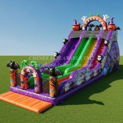 Celebrate spooky fun with this Halloween-themed inflatable slide featuring vibrant ghosts, pumpkins, bats, and spider webs. Its dual lanes offer thrilling descents for kids and party guests, while the bright purple and orange colors set the perfect eerie atmosphere. Ideal for seasonal events, this inflatable slide festive design with exciting play for a memorable Halloween experience.