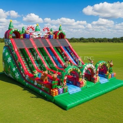 Celebrate the festive season with this spectacular Christmas-themed inflatable slide featuring colorful candy canes, decorated trees, and cheerful reindeer. Designed for hours of outdoor fun, its multiple lanes ensure non-stop excitement for kids and family gatherings. Perfect for holiday events and winter festivals, this durable, eye-catching slide brings joyful holiday spirit to any celebration.